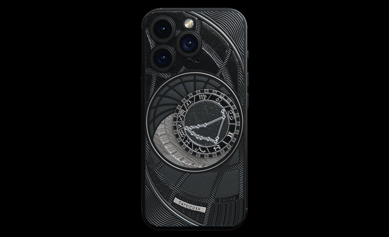 Capricorns, today we present to you Capricorn. Your smartphone has a sky vault with your stars on it. This is a panel of 24 black zirconia, created on titanium with a PVD coating. We highlighted the shine of the black diamond plaque with an black composite and finished the composition with a meteorite fragment on classic black calf leather.