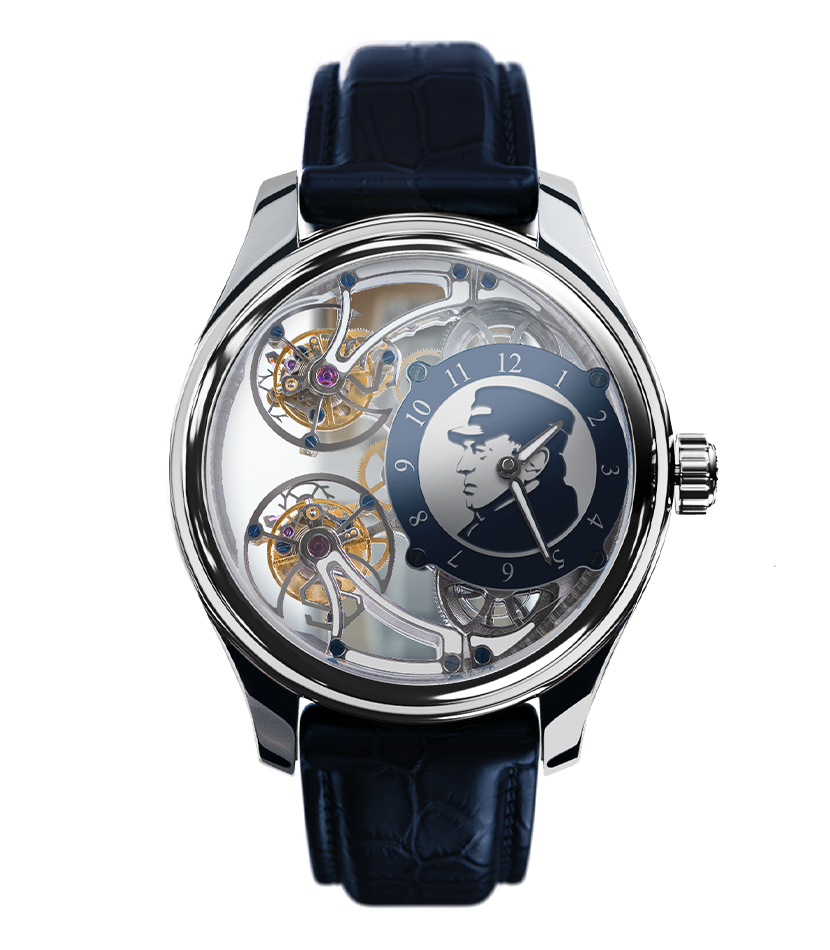Stargazer symbolizes humanity's desire for knowledge, the stars, and space. By gazing at the stars, people take the first step toward space travel, such as the flights of the Starship spacecraft. The watch symbolically combines the blue appearance of the night sky, a tourbillon at the 6 o'clock position, and an authentic piece of the SpaceX Starship at the 12 o'clock position. Stargazer pays tribute to the past, embraces the present, and looks toward the future.