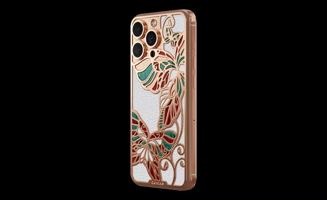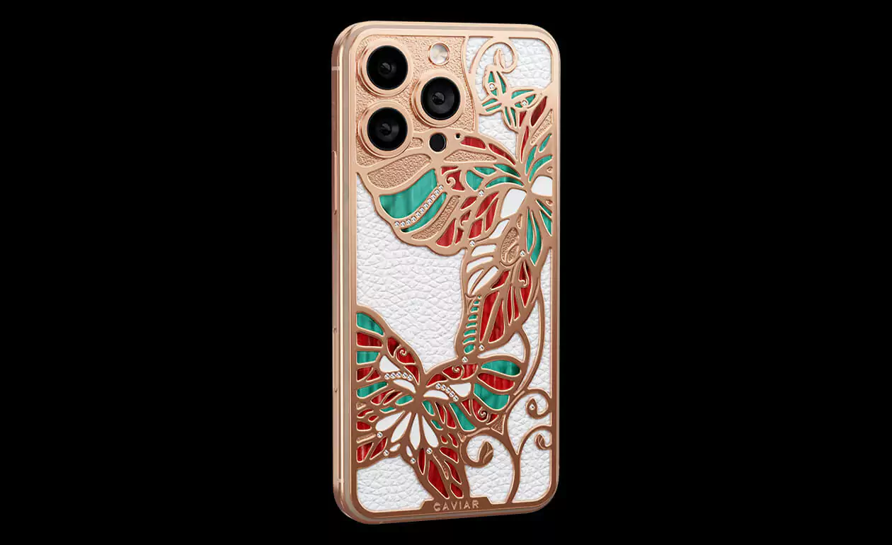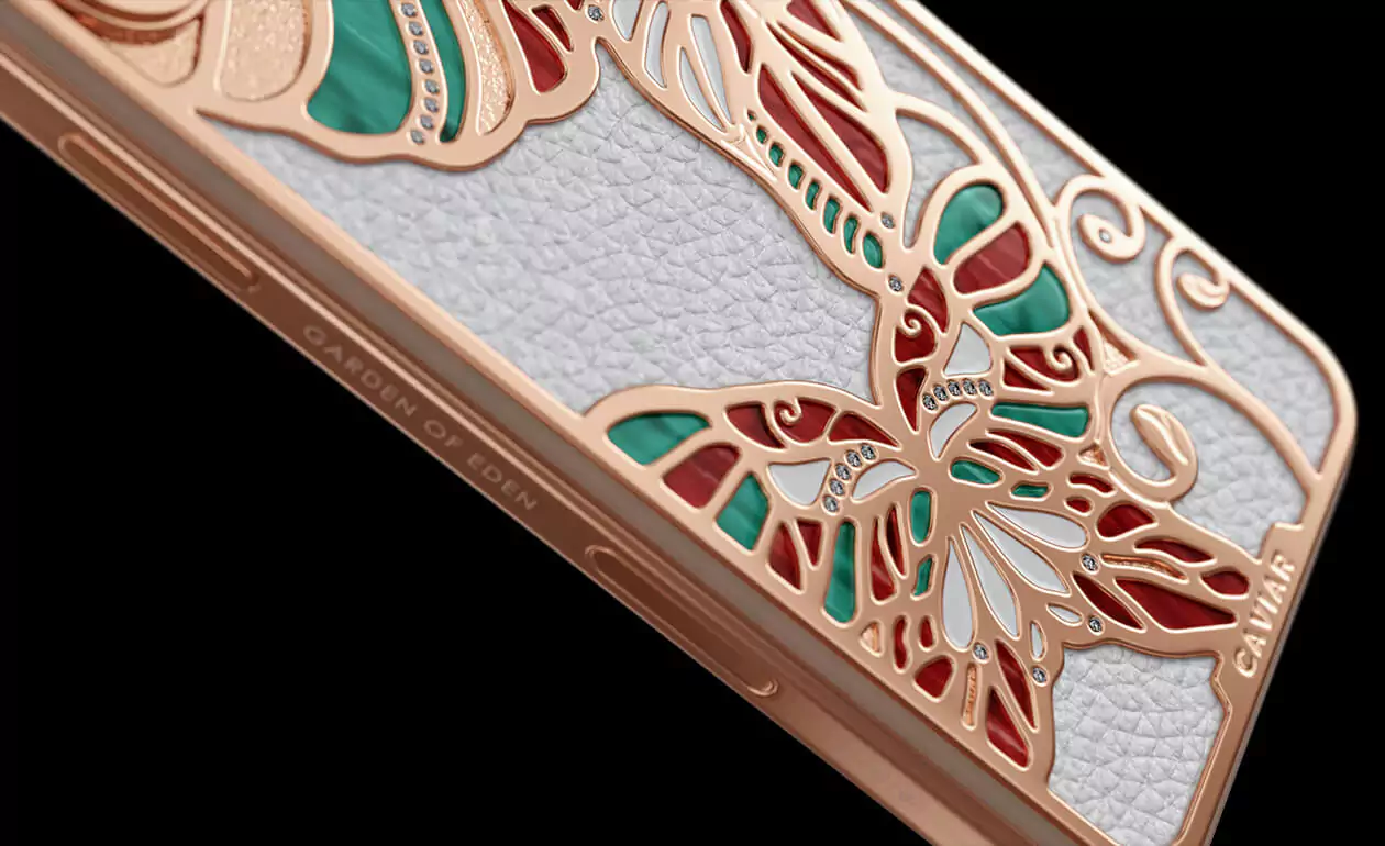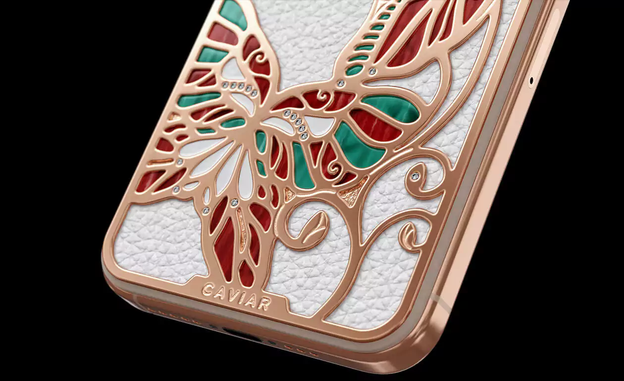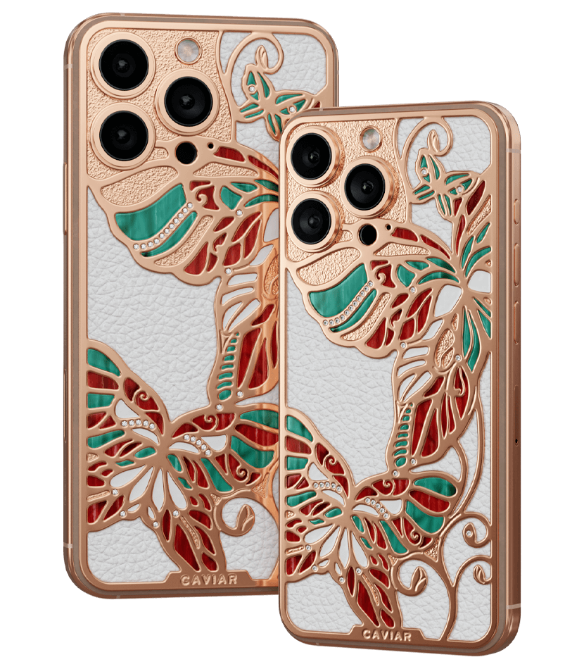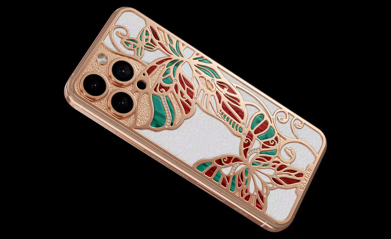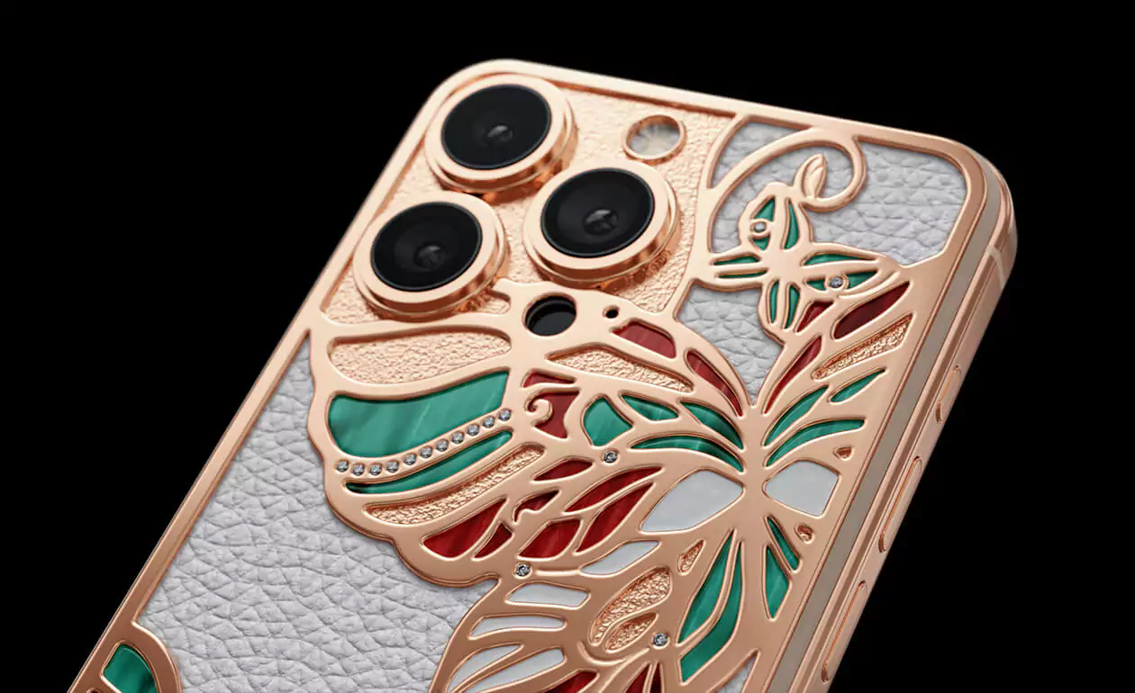 Tropical butterflies embody transformation, beauty, and the vibrant essence of nature. Every glance at your phone becomes a journey into a paradise garden. Lovely Butterflies is a custom iPhone created by high-class jewelers. The graceful butterflies by Caviar are covered in 24-karat rose gold, adorned with 35 diamonds, colorful enamel and kirinit.