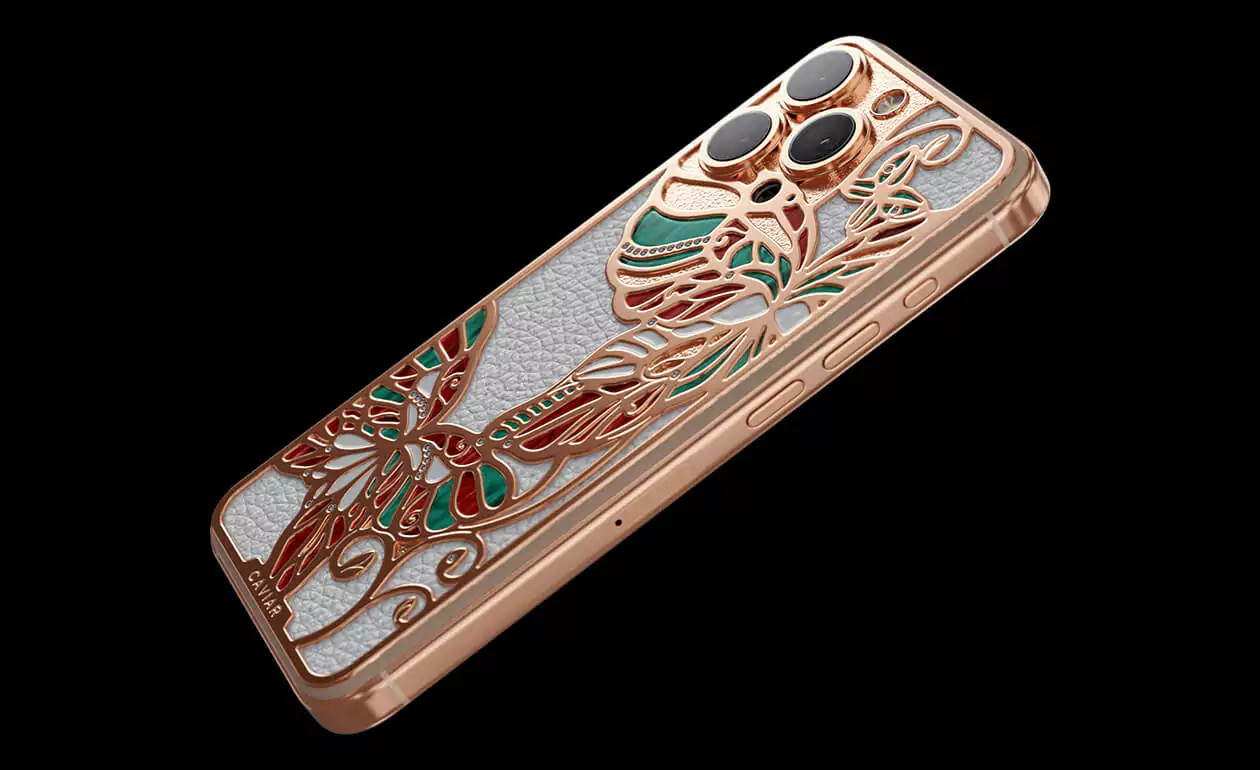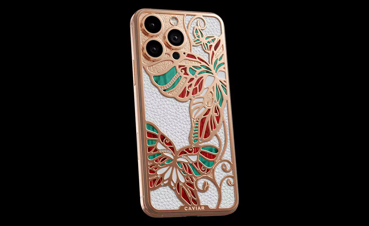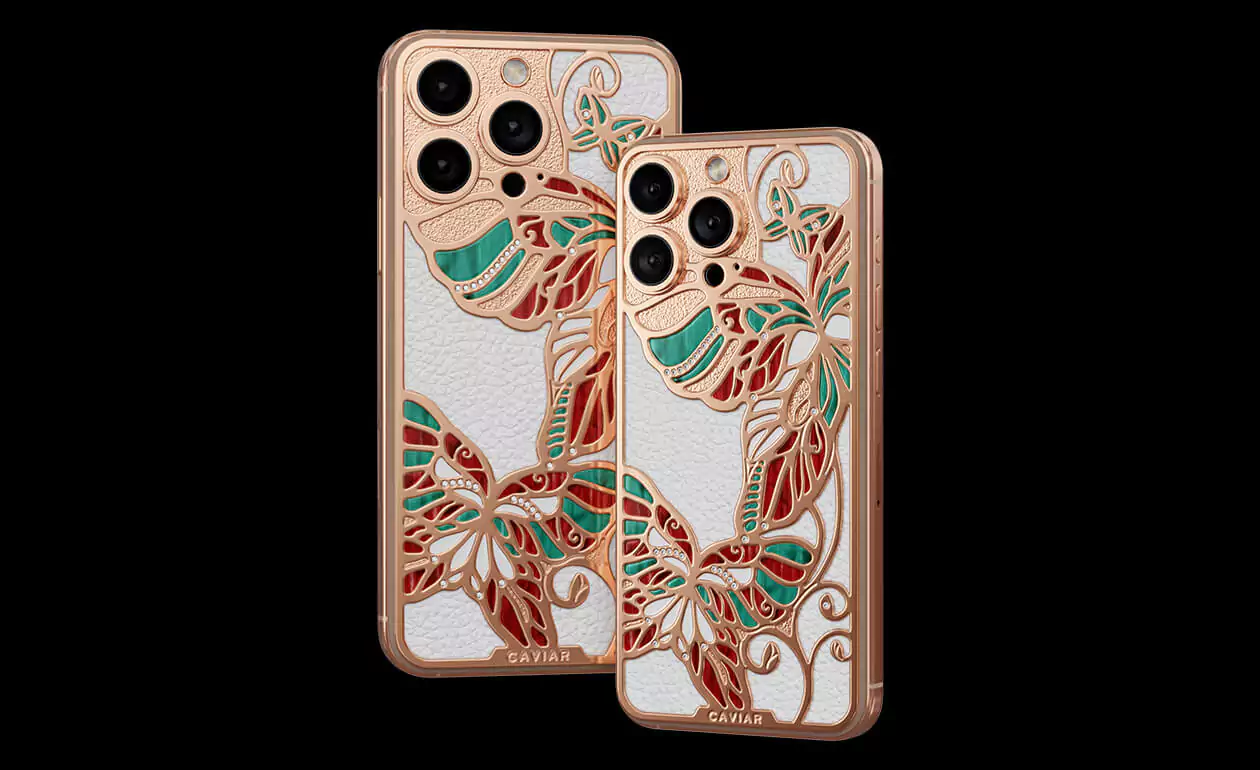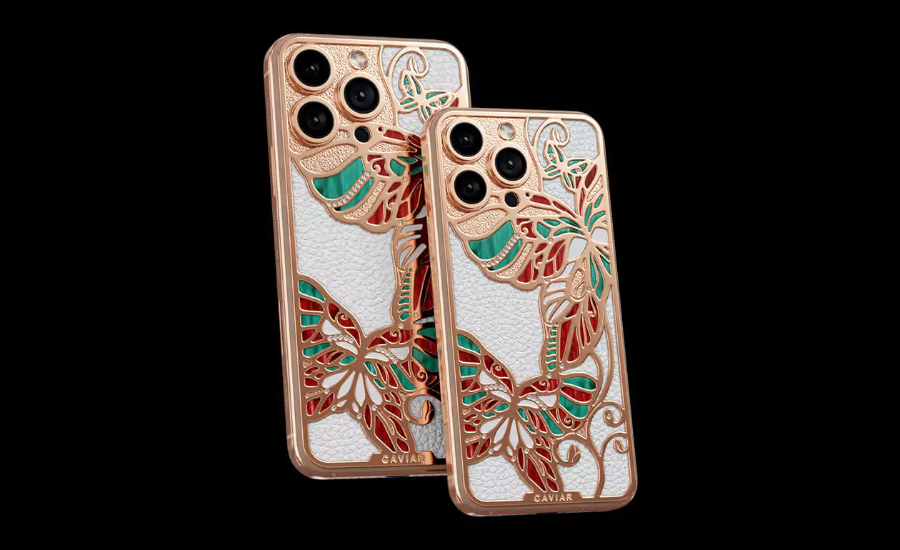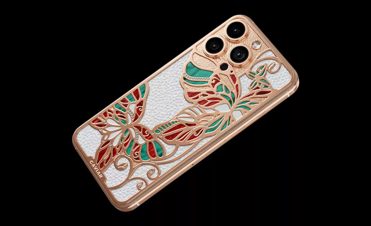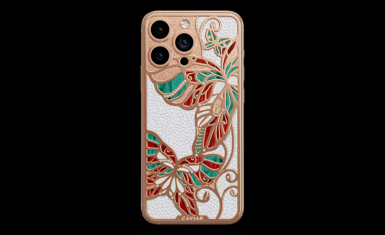 Tropical butterflies embody transformation, beauty, and the vibrant essence of nature. Every glance at your phone becomes a journey into a paradise garden. Lovely Butterflies is a custom iPhone created by high-class jewelers. The graceful butterflies by Caviar are covered in 24-karat rose gold, adorned with 35 diamonds, colorful enamel and kirinit.