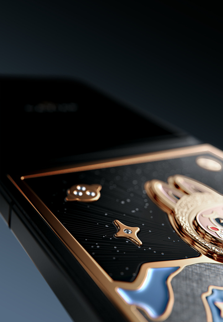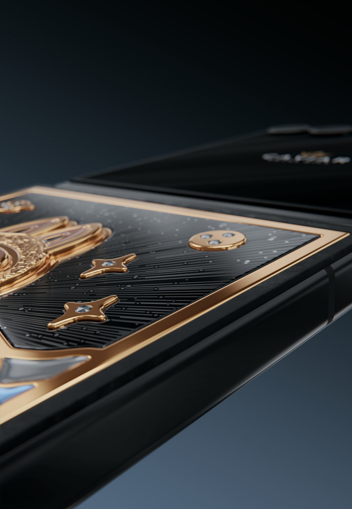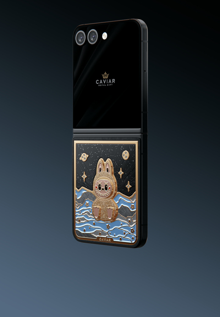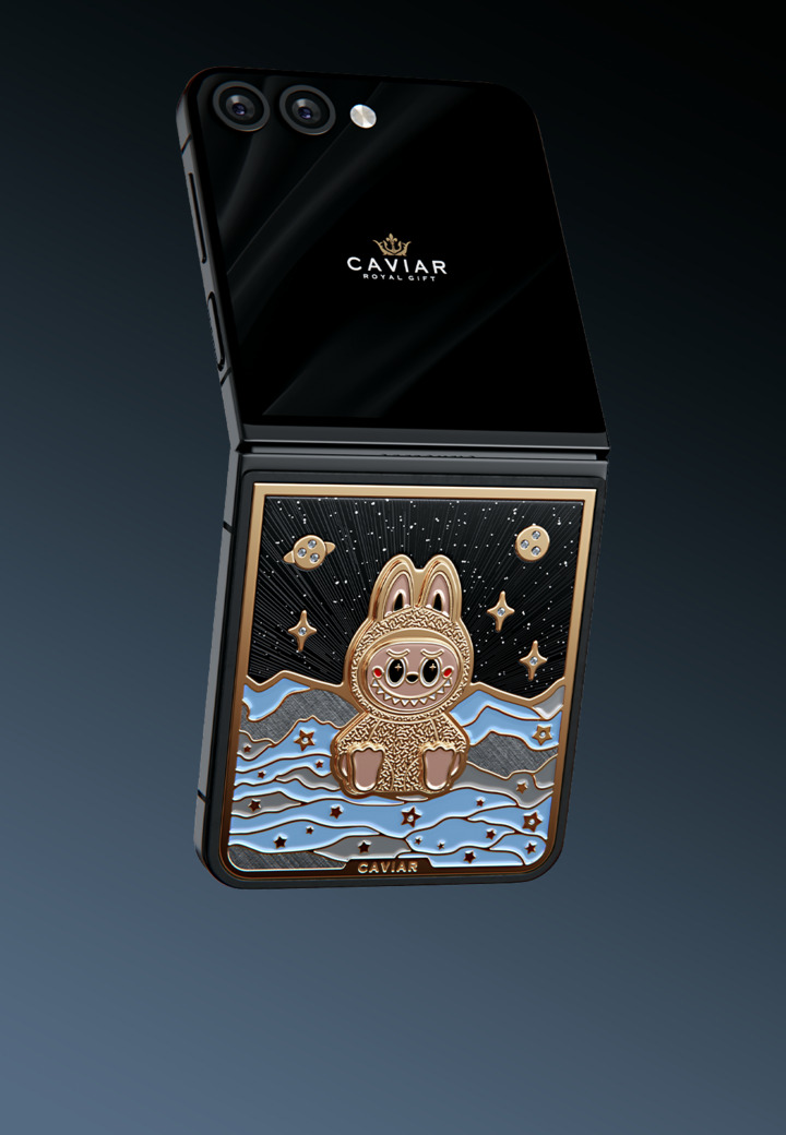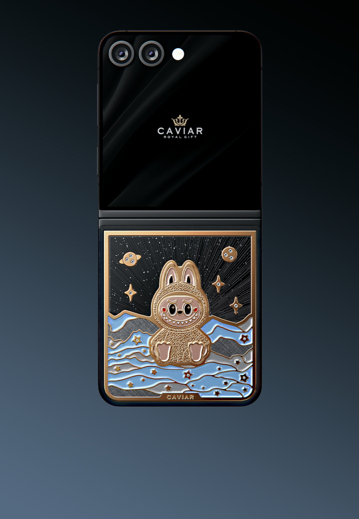 A designer “compact” Samsung, inspired by the image of Labubu — a charming character that has captured the hearts of collectors around the world. Enchanted by its appeal, Caviar created its own hero — Cabubu: a sweet cosmic traveler landing on Venus, the planet of dreams, beauty, and inner harmony. The centerpiece is a delicate figure of Cabubu, adorned with fine jewelry enamel and 24K gold. The magical background with soft lines and golden accents is handcrafted using jewelry enamel and fragments of genuine meteorite. A creation for those who see not just form, but inspiration in design.