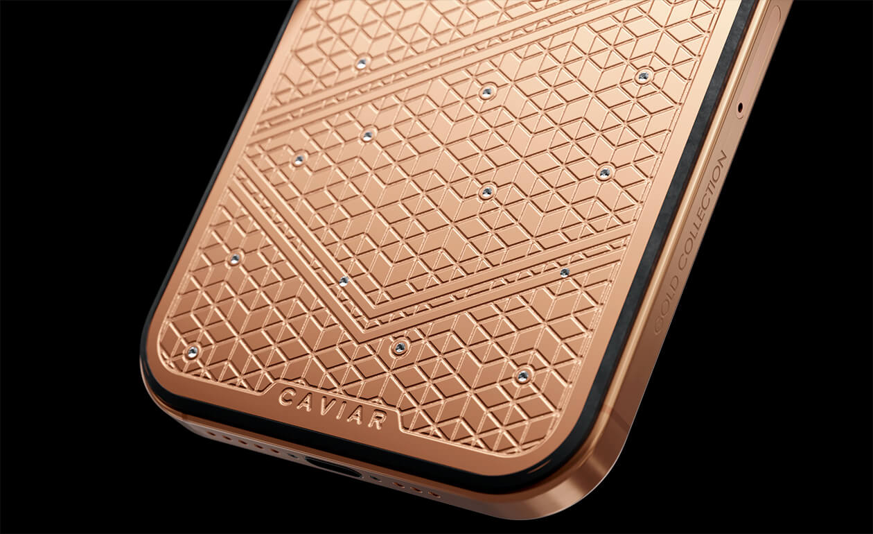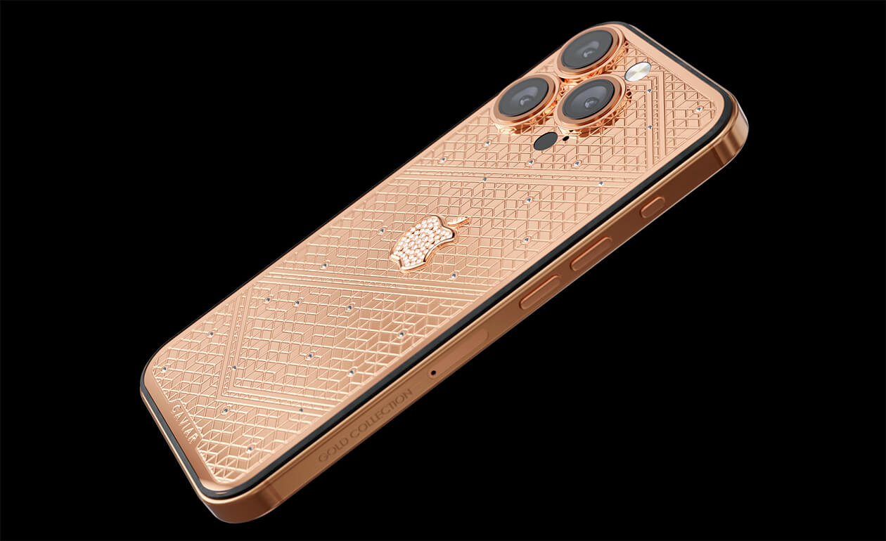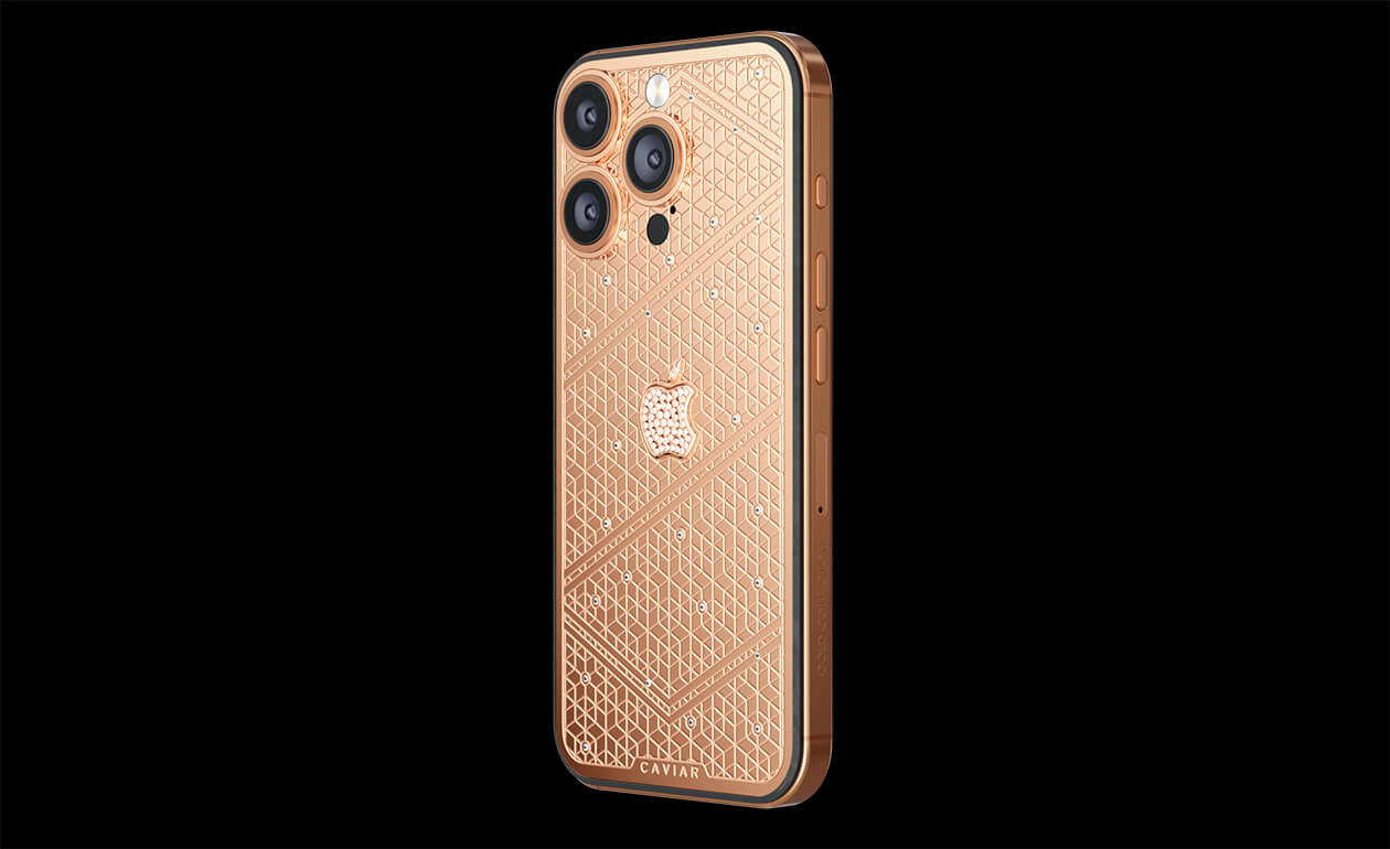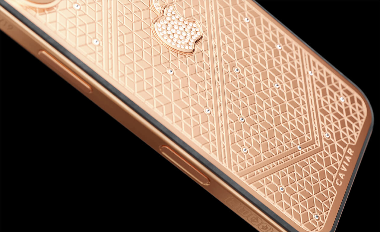 Caviar's masters have captured the golden sunlight reflections in the iPhone's body. The vivid asymmetry of lines symbolizes creative chaos and the quest for an antique ideal. We have complemented this golden extravaganza with a sprinkling of diamonds. At the center - a precious apple made of diamond mosaic.