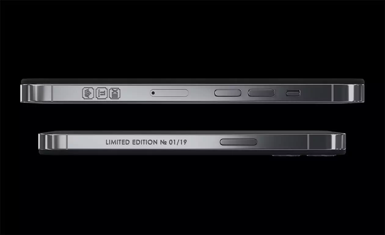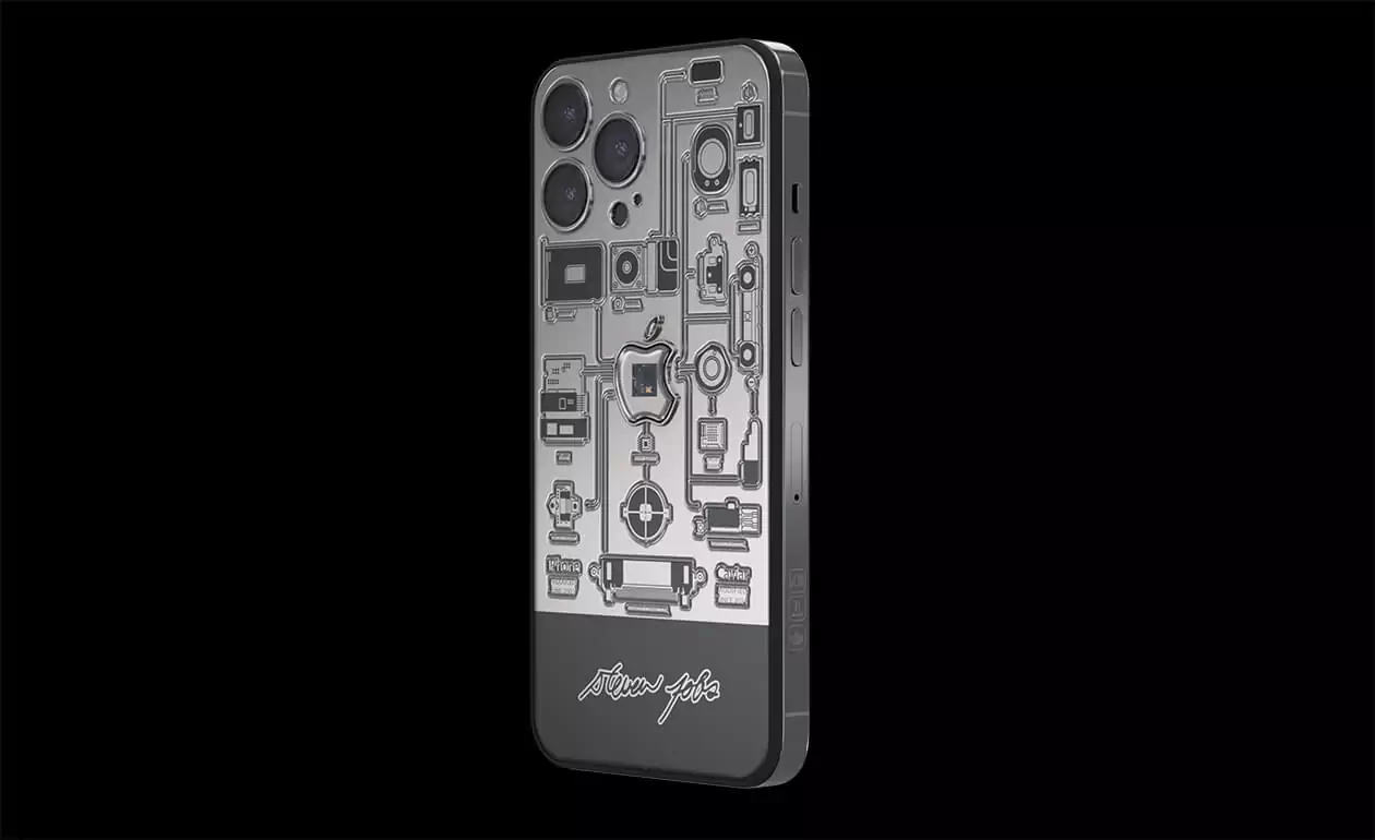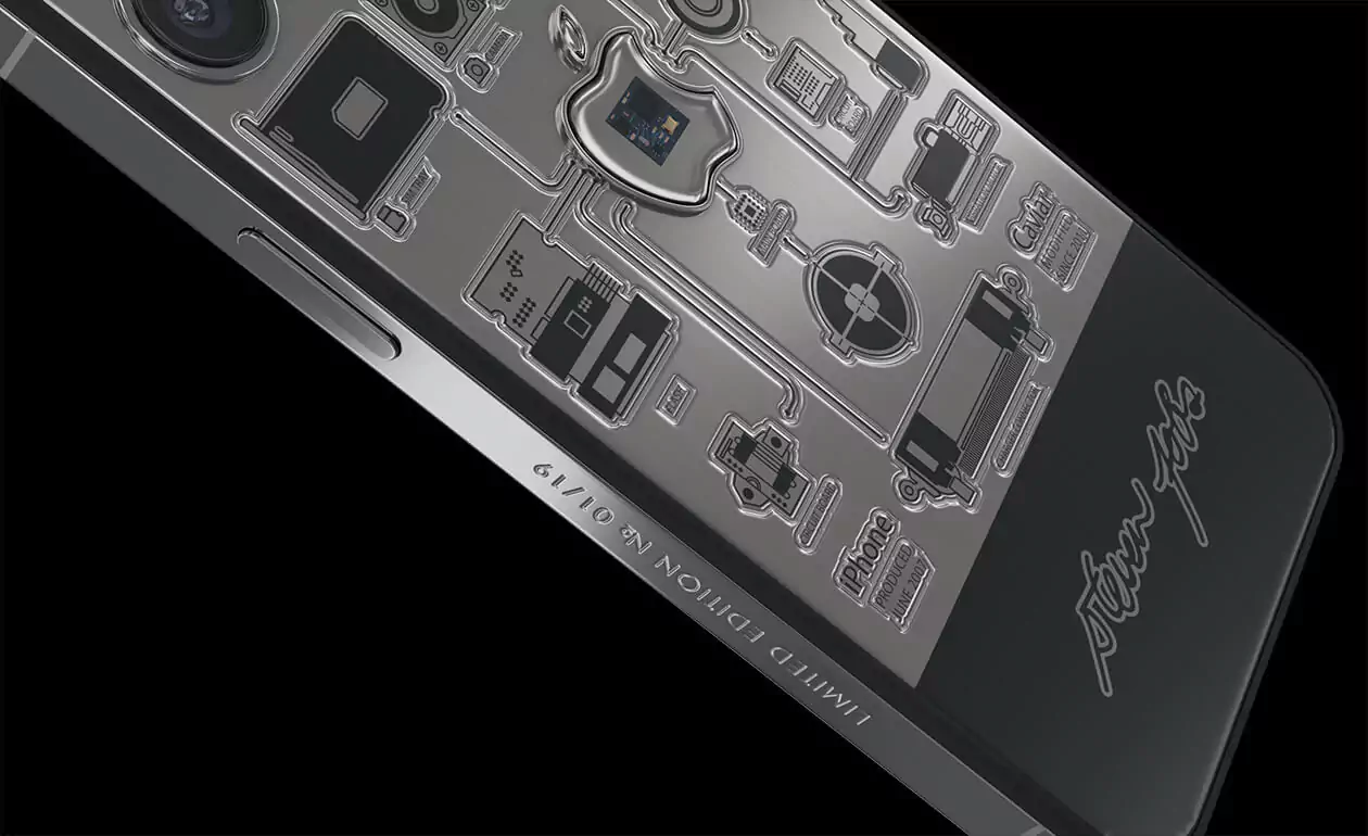In the center of the case made of aviation titanium, there is a sealed capsule in the form of Apple's branded bitten apple with an embedded fragment of the motherboard of the very first iPhone 2G. The back cover of the smartphone is decorated with high-precision engraving depicting the technical elements of the device, which are connected together. They are striving towards the center of the world - the Apple logo - like a circulatory system pushing blood towards a pulsating heart.