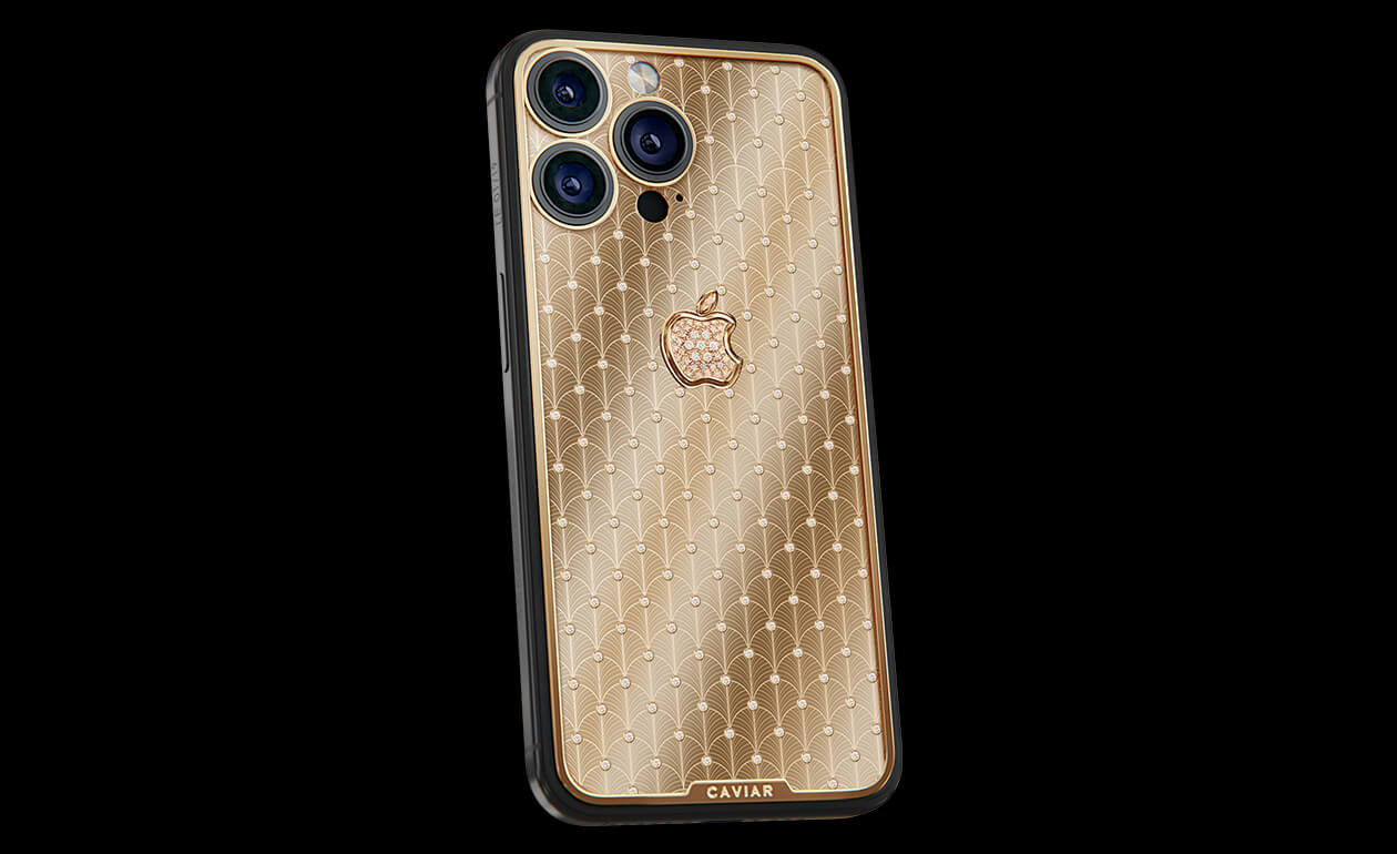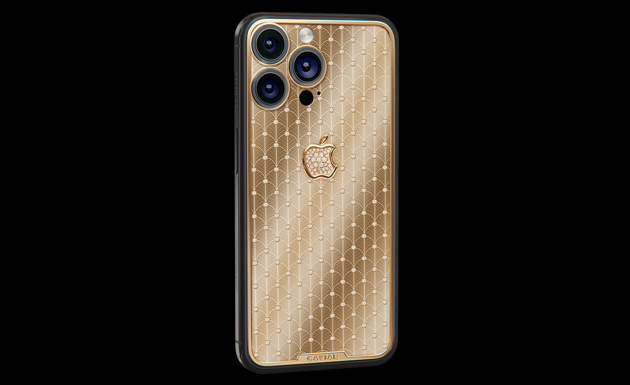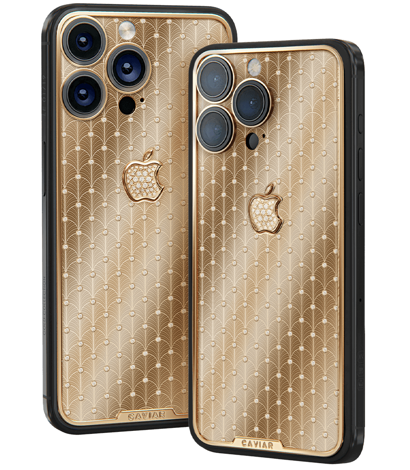 Tropical Art Deco patterns on the iPhone case. Elegant design, echoing the art of the modernist era. Palm leaves adorned the rich interiors of the aristocracy of the past century. Caviar covered the device's gold case with a magnificent ornament. Caviar's craftsmen complemented the golden splendor with a scattering of diamonds. In the center is a precious apple made of diamond mosaic.