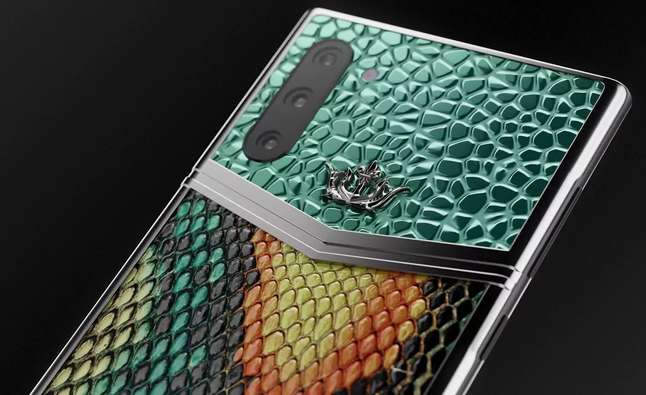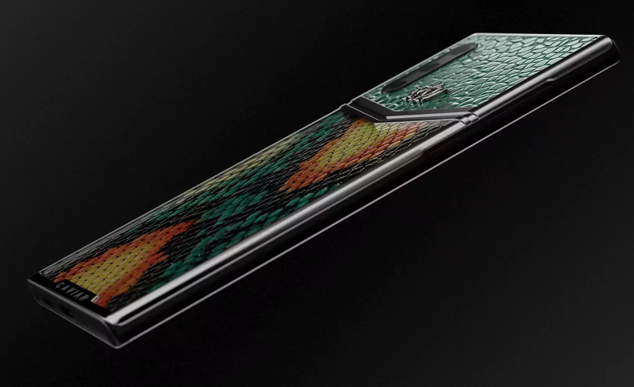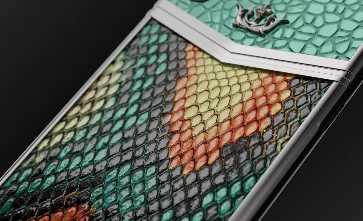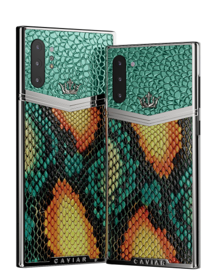 Exotic snake leather that presents an unbelievable combination of colors is the model’s composition center. The smartphone’s upper part is made of kirinite and decorated with a relief, handmade ornament. The stone is notable not only for its noble color, but also for its special firmness. Silver V-shaped “tick”, which has already become Caviar carte-de-visite, divides the smartphone into two parts balancing the composition and stretching the body to let it look slimmer.