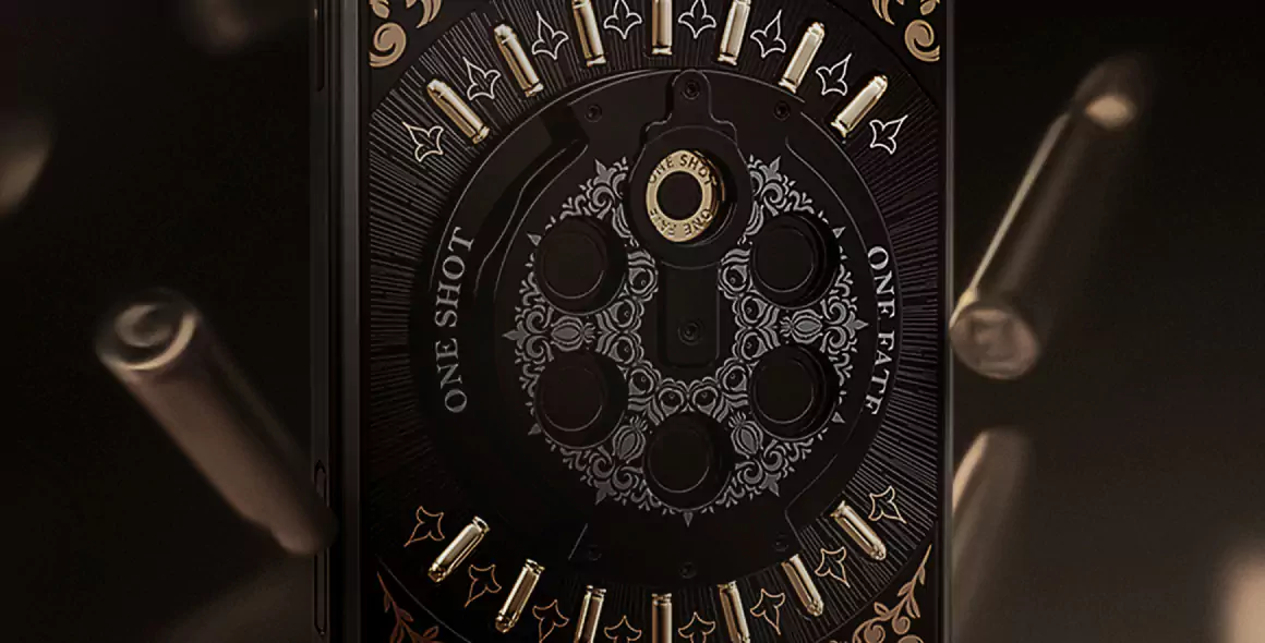 At its heart — a real rotating revolver cylinder with a single bullet. A bold symbol of risk, resolve, and the courage to go all in.