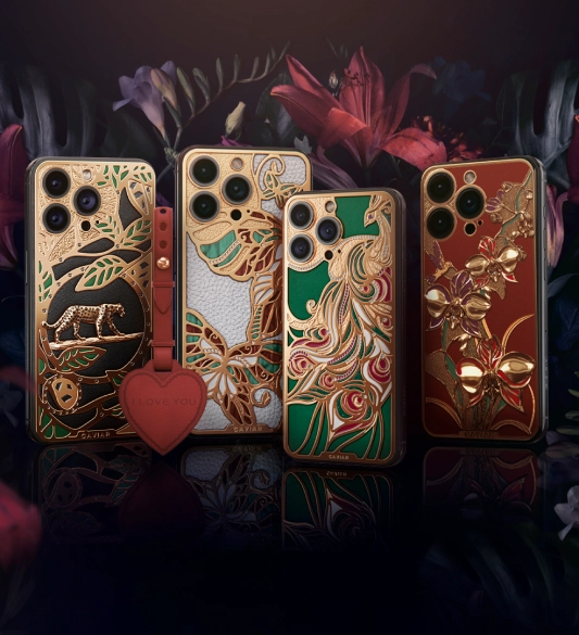 Impeccable craftsmanship in working with jewelry enamel. Our artisans meticulously encrust each phone with precious stones and apply enamel to the golden surface by hand.