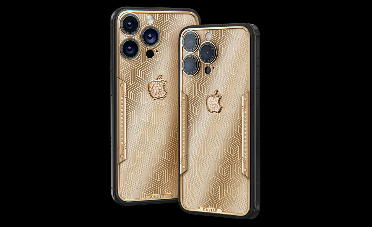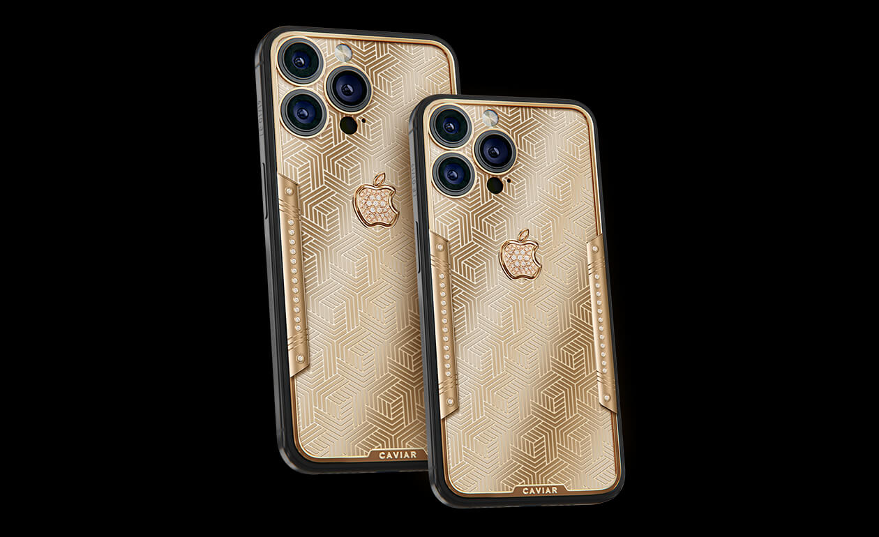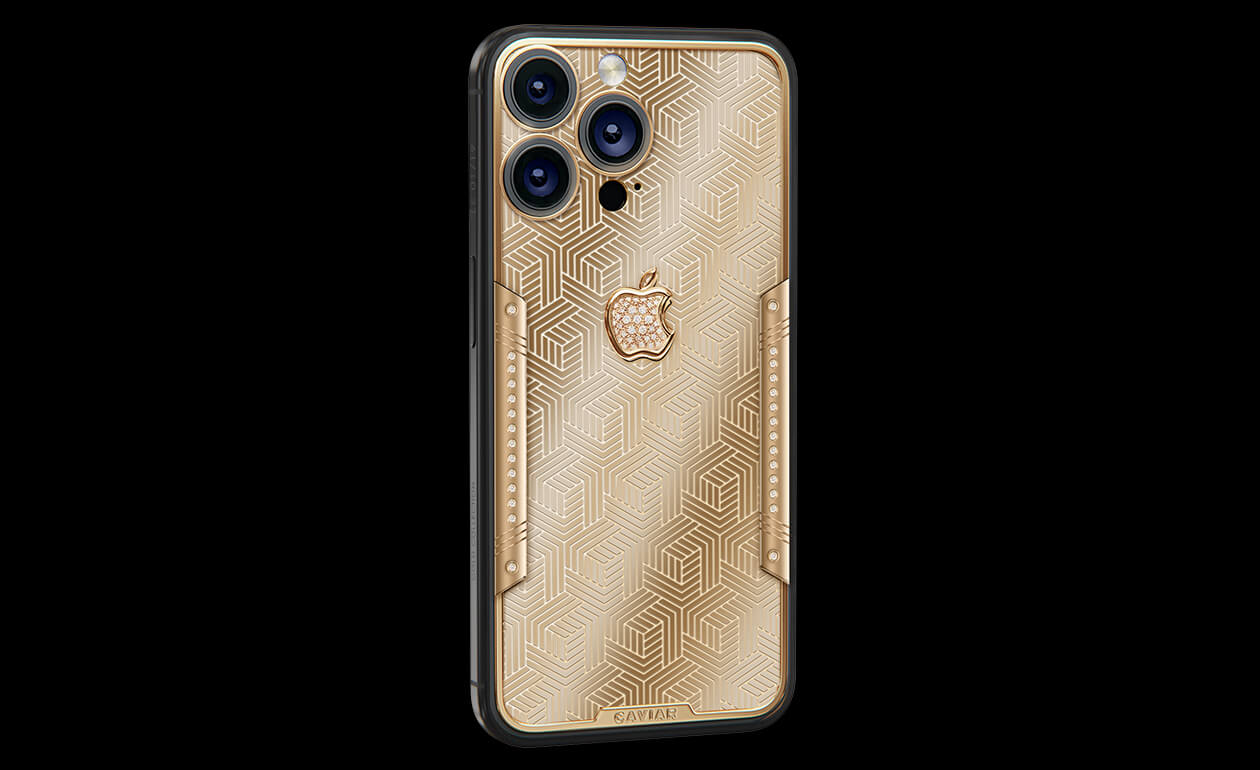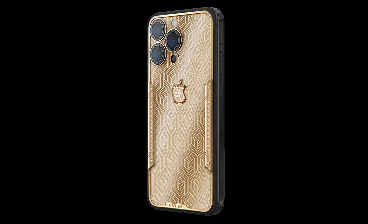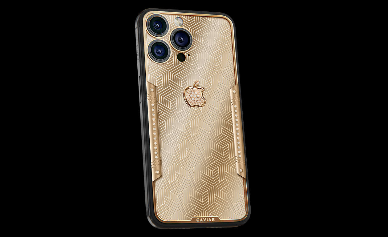 Geometry of luxury on the iPhone's body. Intertwining lines symbolizing the pursuit of perfection. Caviar's masters enhanced the golden splendor with a scattering of diamonds. At the center lies a precious apple made of diamond mosaic.