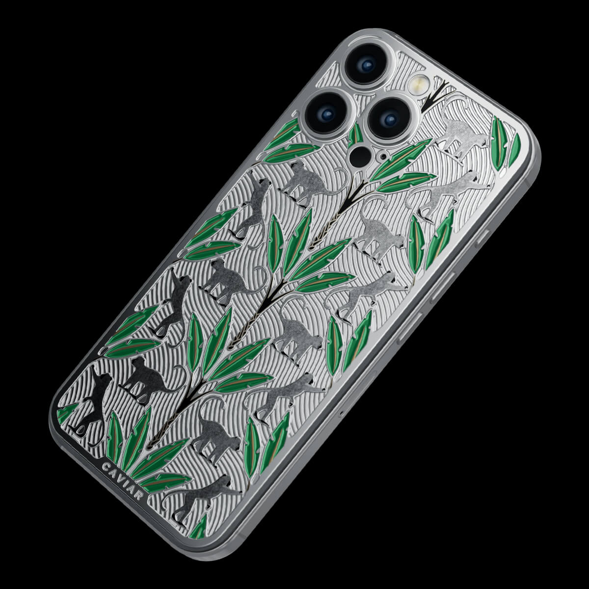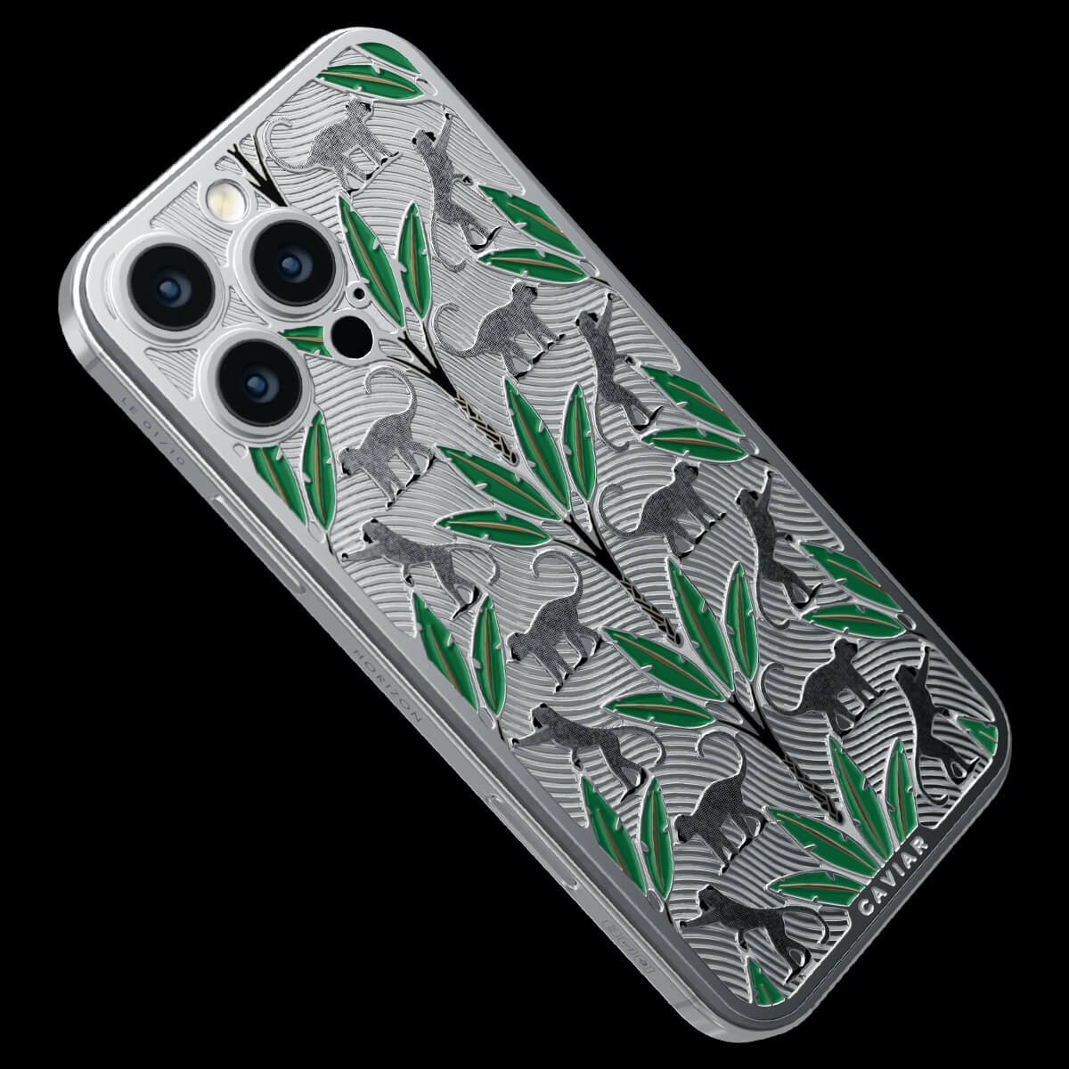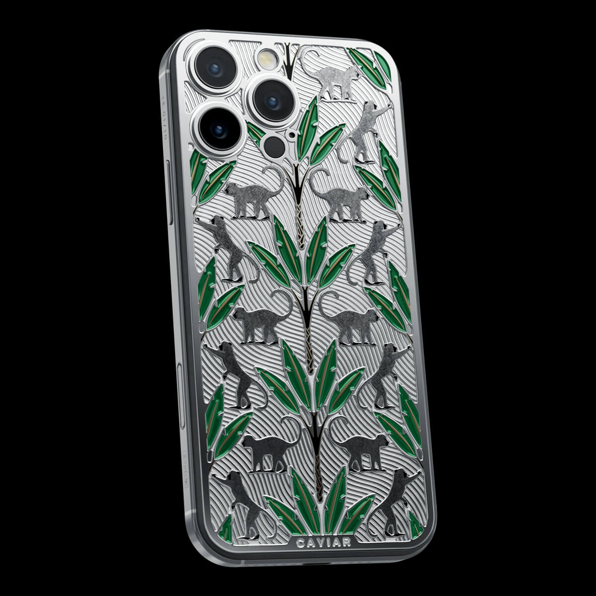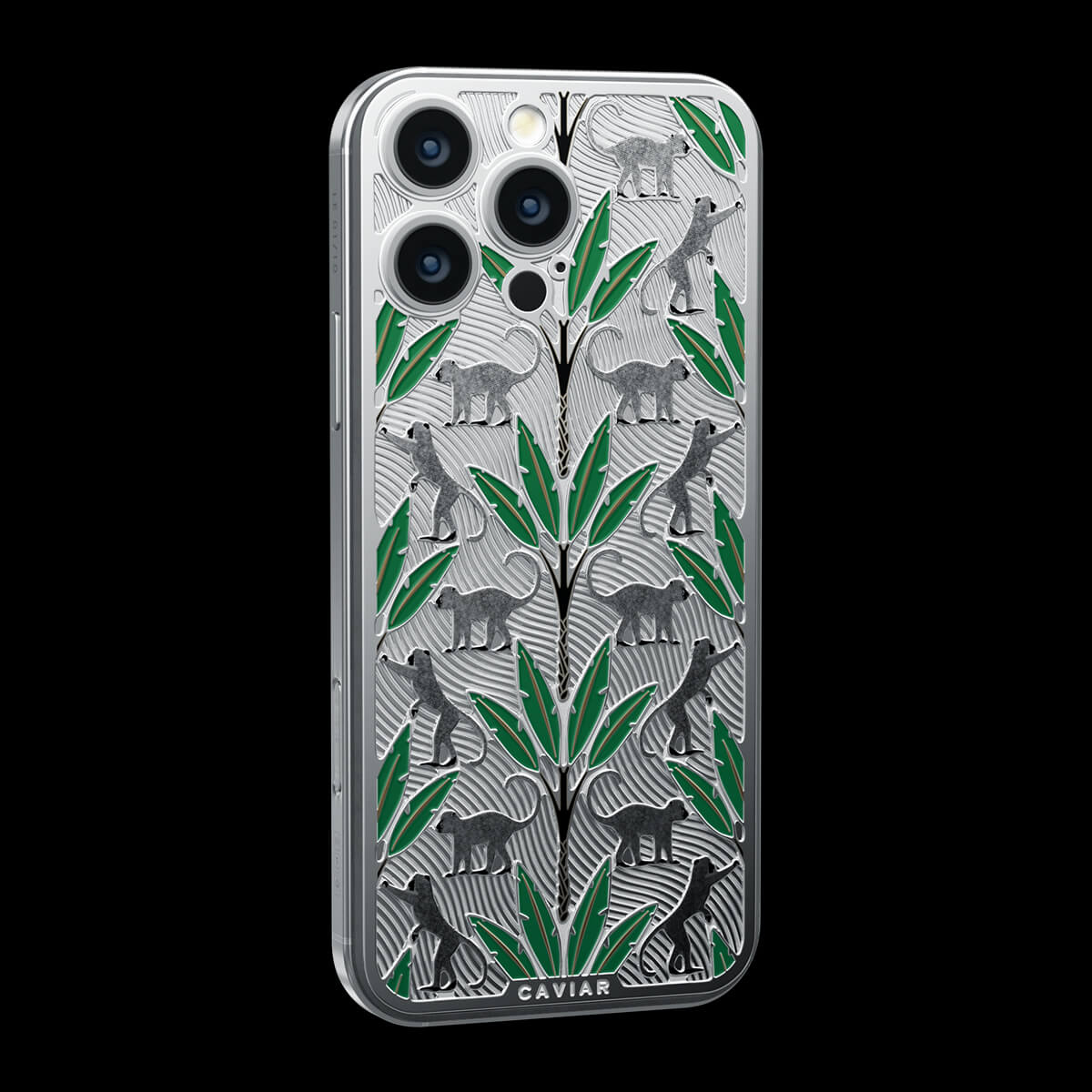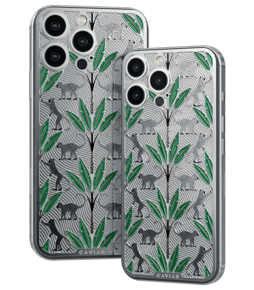 The titanium surface of the Gibraltar by Caviar seems to be sculpted by nature itself—engraved with the proud silhouettes of Barbary macaques, which have become symbols of this place. Black palm trunks complete the picture, while emerald enamel leaves bring the design to life.