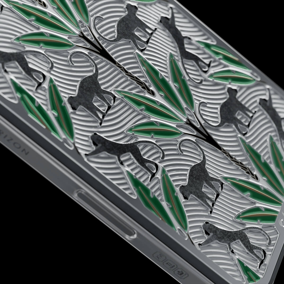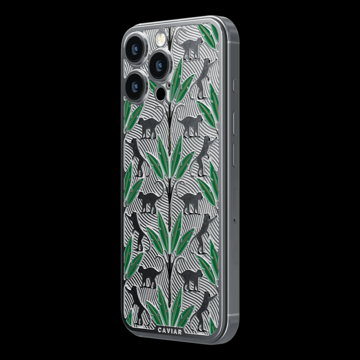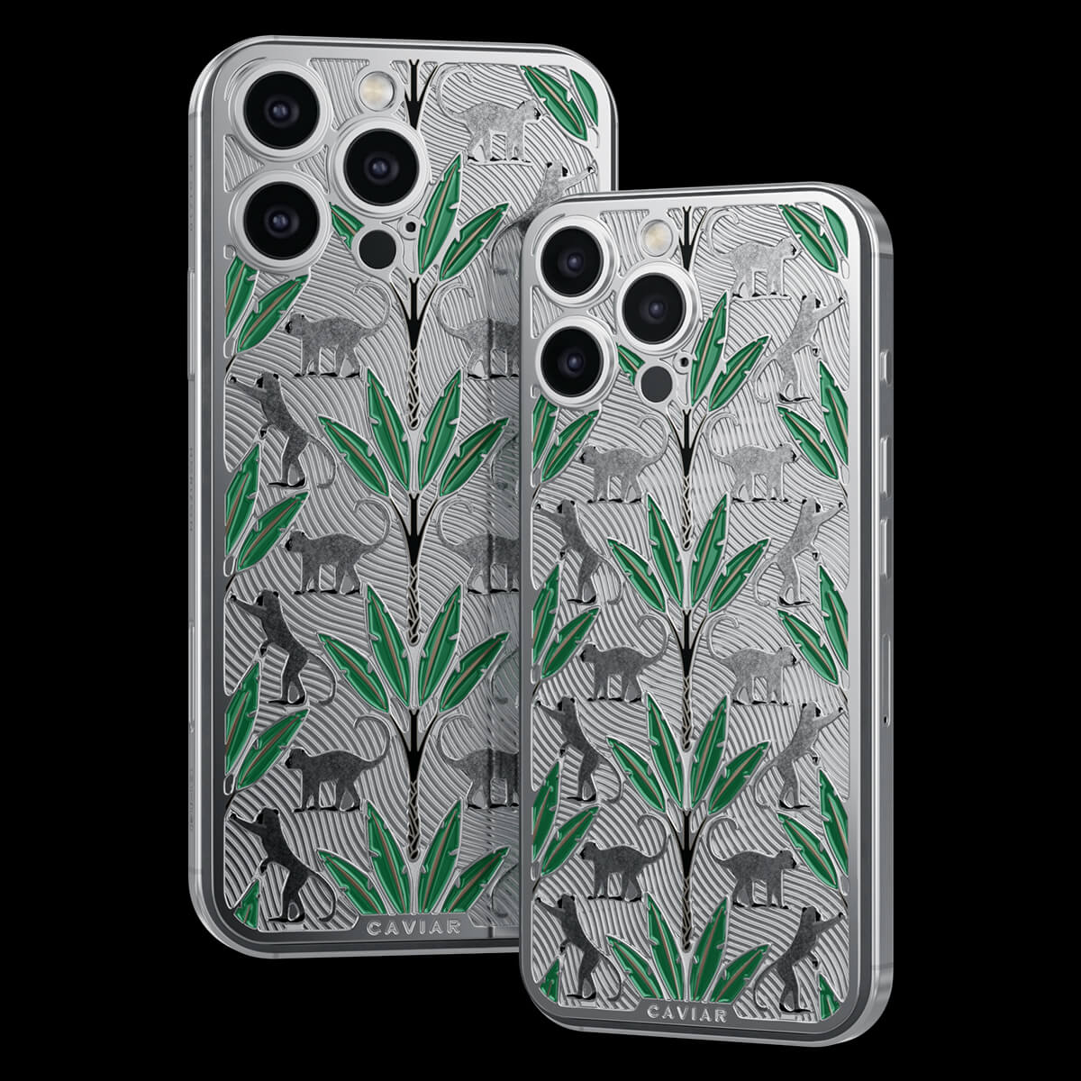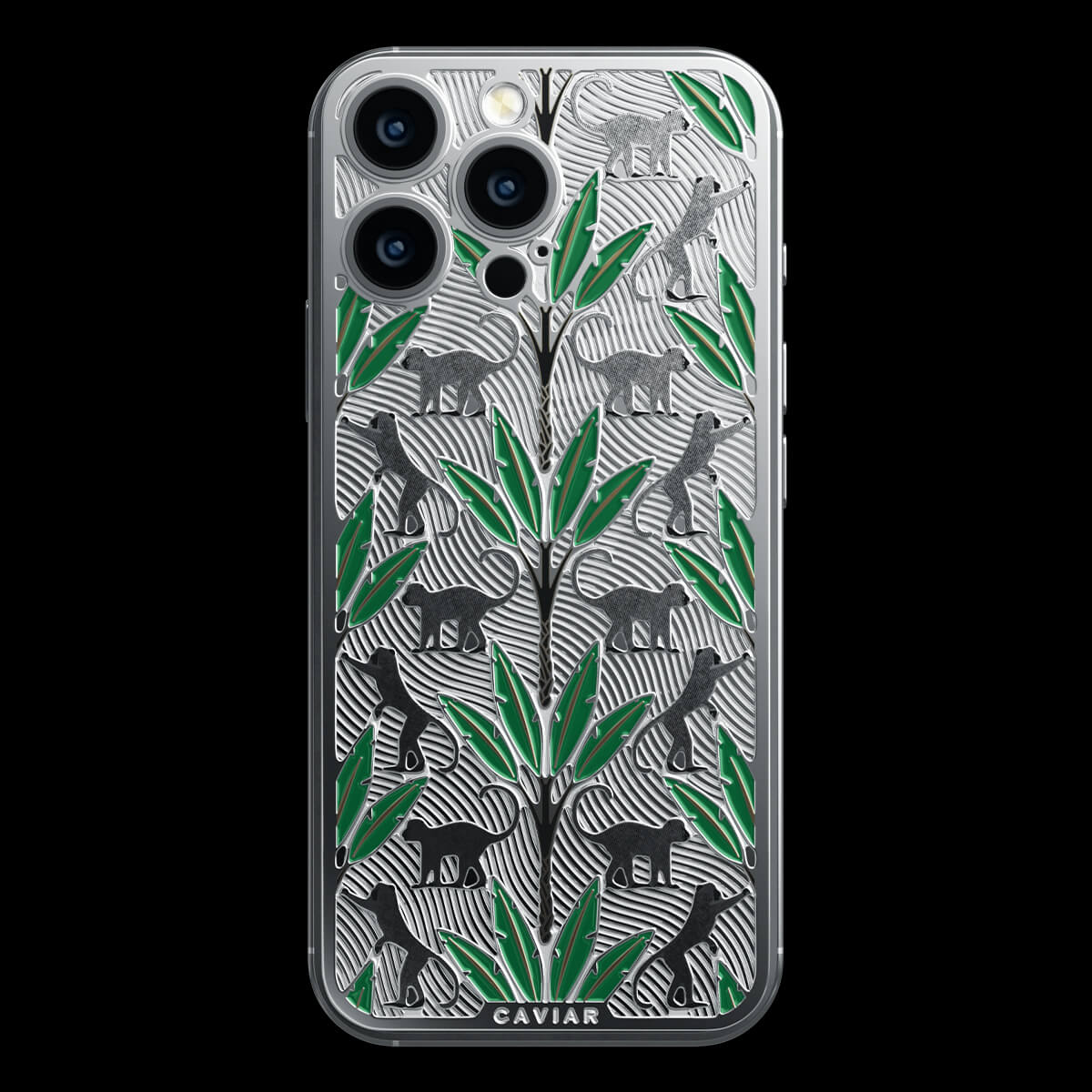 The titanium surface of the Gibraltar by Caviar seems to be sculpted by nature itself—engraved with the proud silhouettes of Barbary macaques, which have become symbols of this place. Black palm trunks complete the picture, while emerald enamel leaves bring the design to life.
