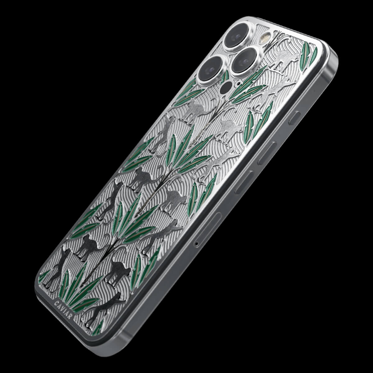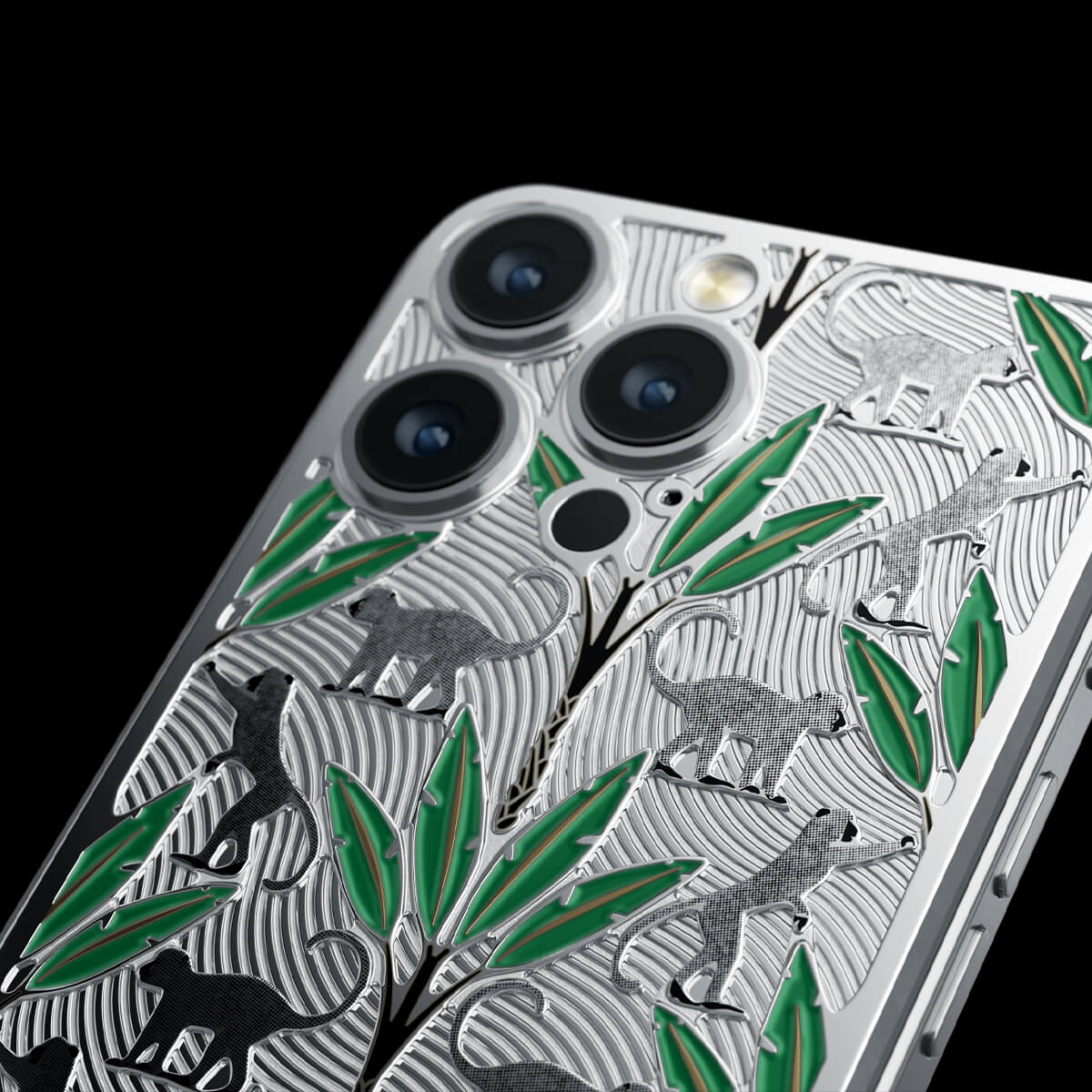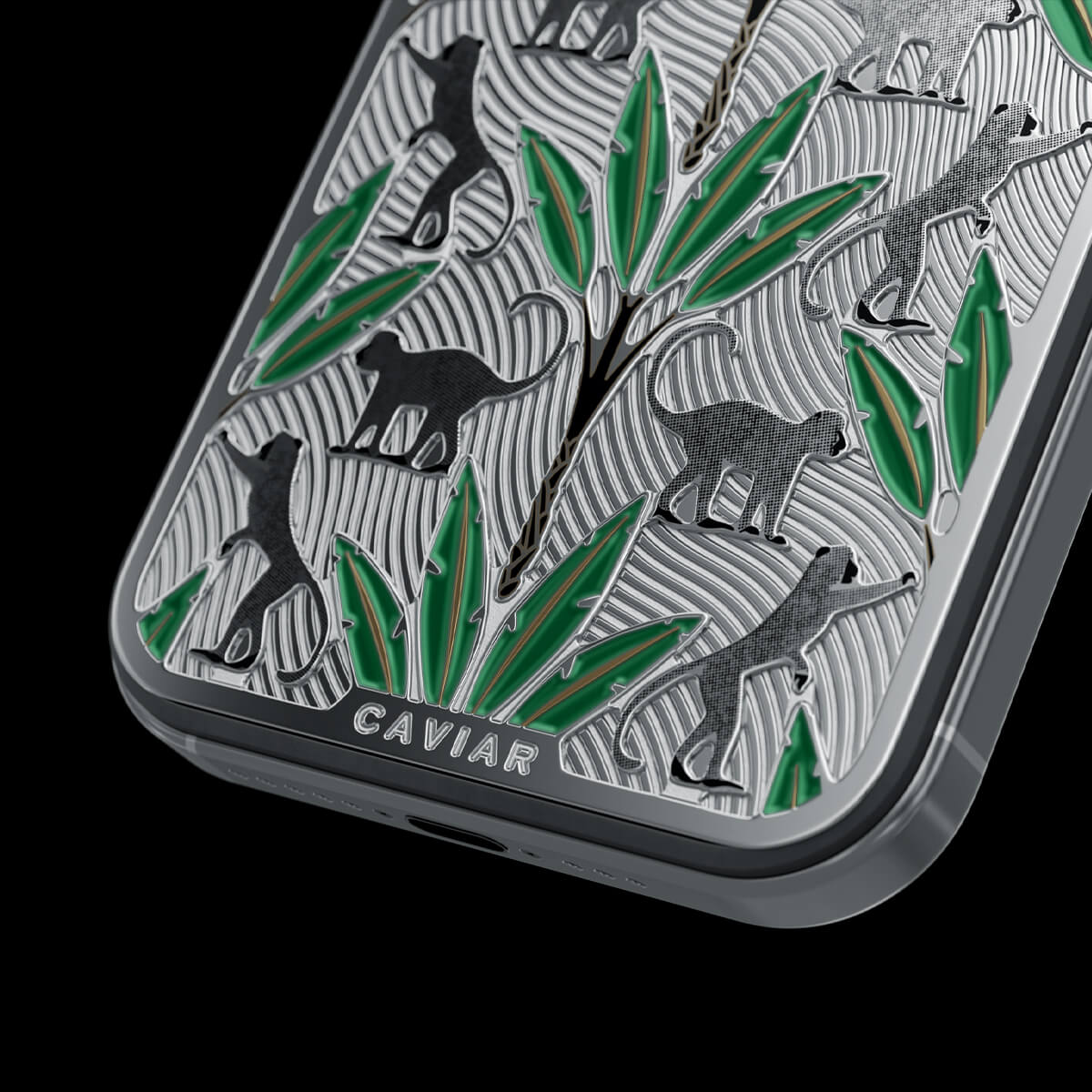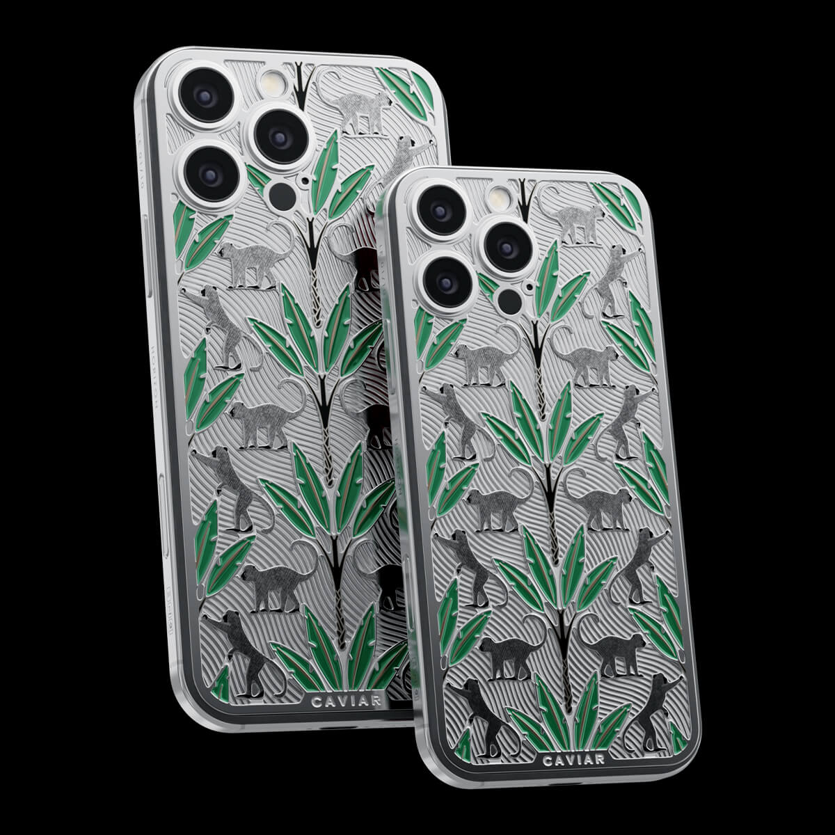 The titanium surface of the Gibraltar by Caviar seems to be sculpted by nature itself—engraved with the proud silhouettes of Barbary macaques, which have become symbols of this place. Black palm trunks complete the picture, while emerald enamel leaves bring the design to life.